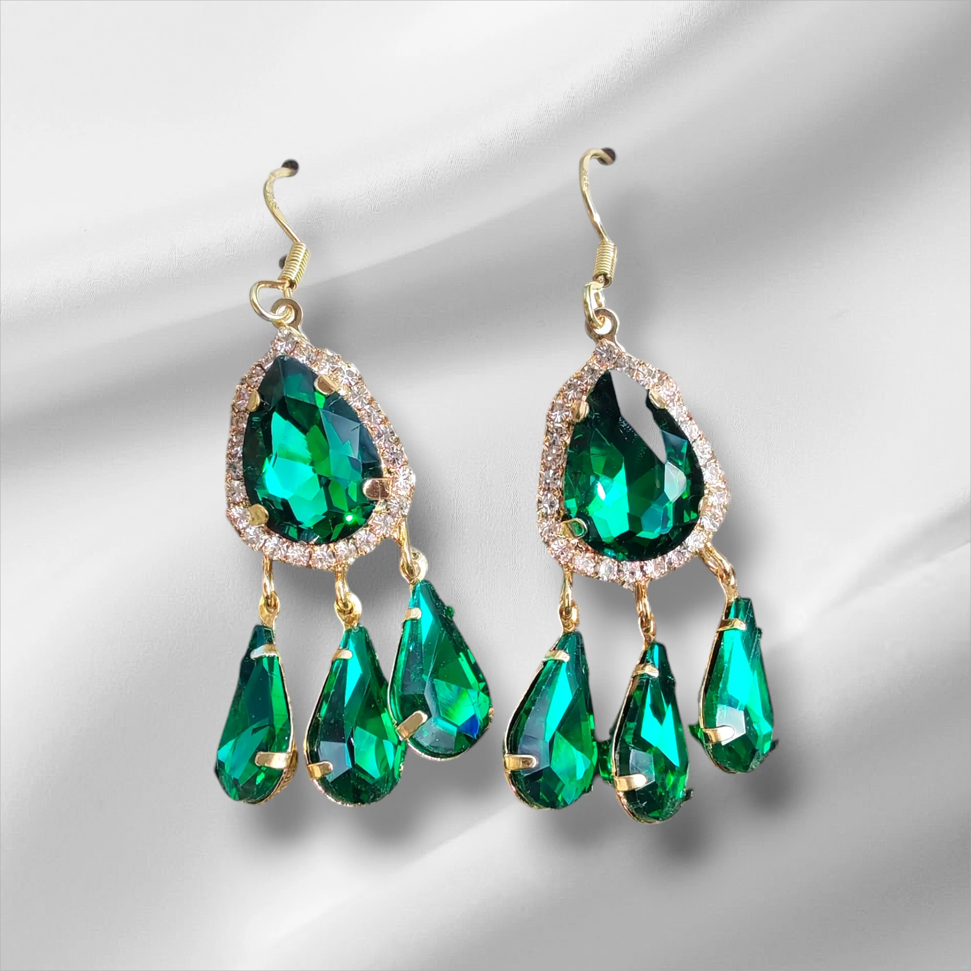 Legyél az este fénypontja ebben a ragyogó smaragdzöld csepp alakú fülbevalóban! Arany tónusú foglalat, apró kristályokkal szegélyezve. Elegáns, akasztós kivitel, amely tökéletes kiegészítő bálokra, esküvőkre vagy alkalmi megjelenéshez.